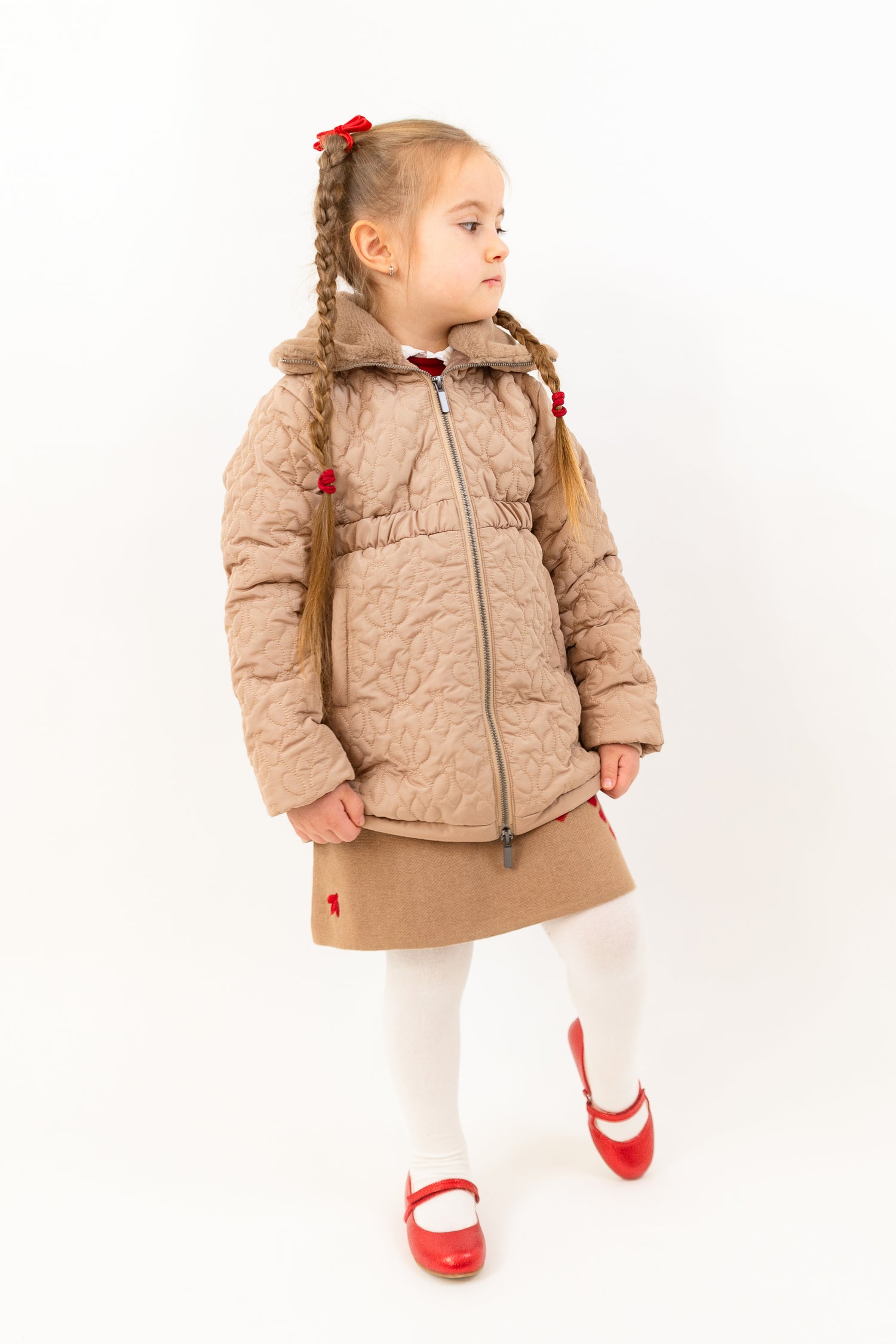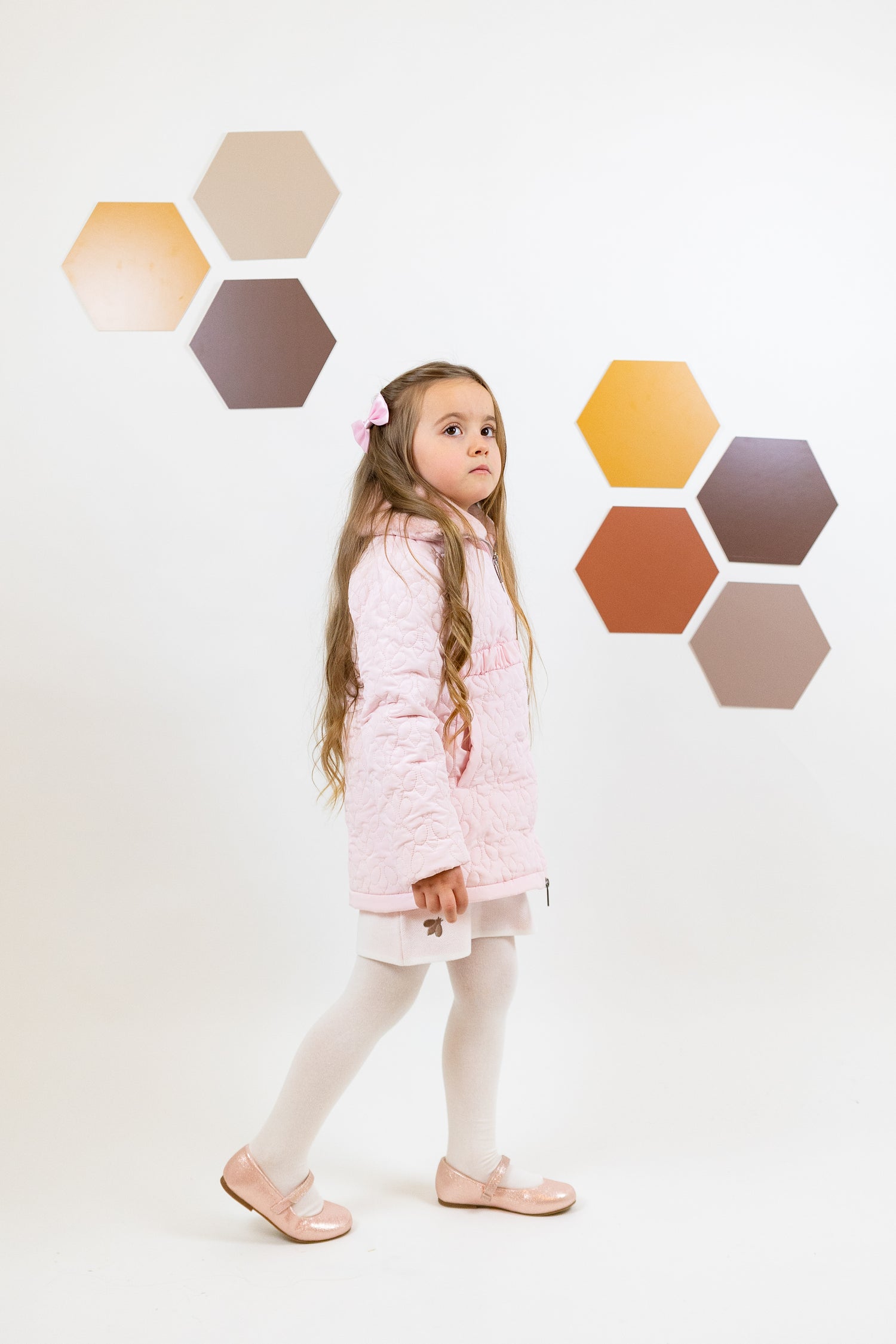 The pink jacket with subtle bee quilting enhances the total look. Together, this outfit seamlessly blends softness with timeless charm, making it perfect for embracing a refined yet cozy style.