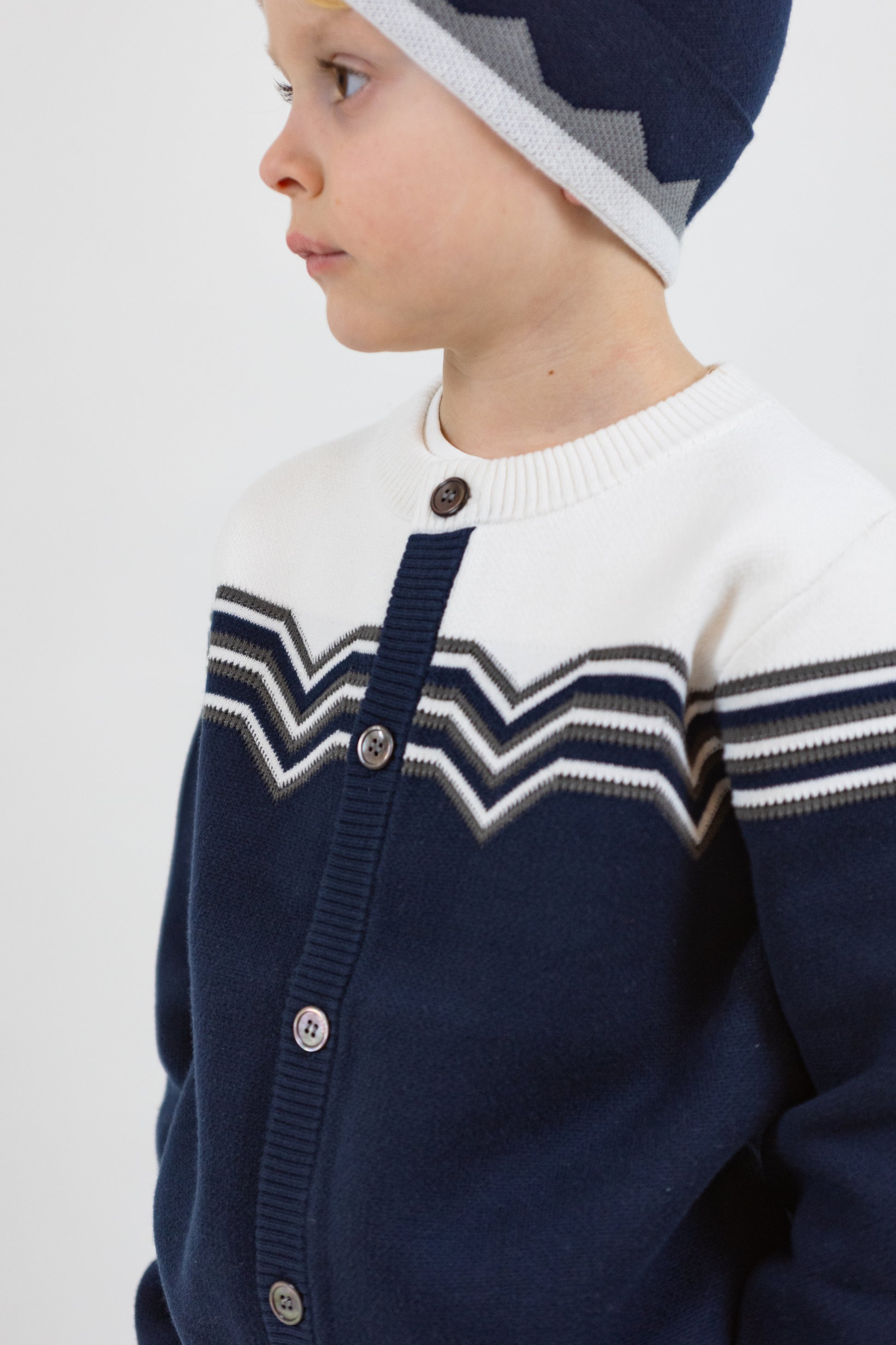 Upplev en lekfull rörelsekänsla med vår eleganta långärmade stickade kofta. Den har en jacquardstickning med en dynamisk Buzz-design. Denna kofta i 100 % bomull ger en touch av sofistikering till vilken outfit som helst. Bekväm och snygg, ett måste.