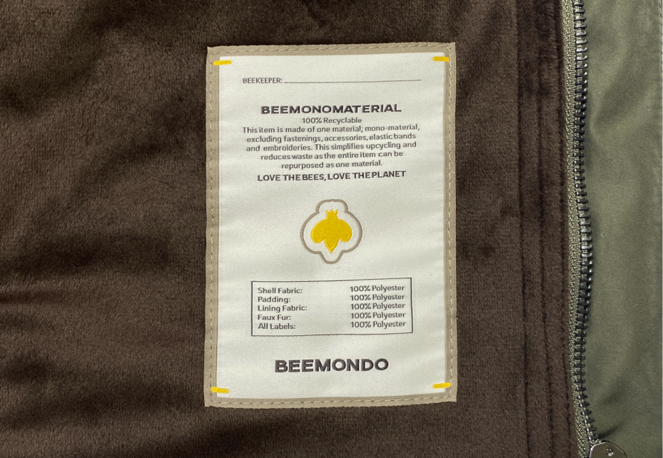 All BEEMONDO items come with informative tags explaining what BEEMONOMATERIAL is about and thus informs and inspires for upcycling. Our aim is to raise awareness about our unique BEEMONDO offer and the value of owning a clothing item made in one material; BEEMONOMATERIAL, and seeing it as a future commodity.