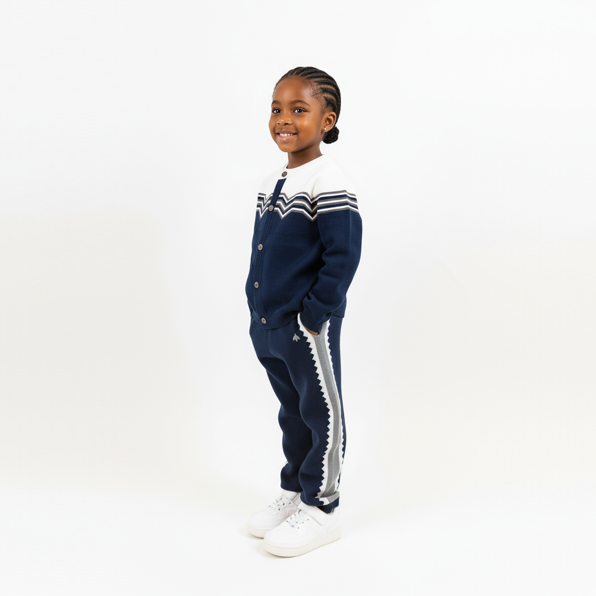 Experience a playful sense of movement with our elegant long-sleeved knit cardigan. It features a jacquard knit with a dynamic Buzz design. This 100% cotton cardigan adds a touch of sophistication to any outfit. Comfortable and stylish, it's a must-have item.